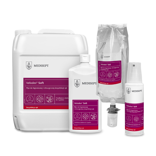 Zastosowanie: Velodes® Soft to gotowy do użycia alkoholowy preparat, przeznaczony do higienicznej i chirurgicznej dezynfekcji rąk. Posiada potwierdzone badaniami spektrum bakteriobójcze, wobec prątków gruźlicy, drożdżakobójcze i ograniczone wirusobójcze. Posiada przedłużone działanie bakteriobójcze. Działa szybko i skutecznie wobec wirusów otoczkowych i nieotoczkowych takich jak m.in. HIV, HBV, HCV, Rota wirus. Przebadany dermatologicznie.